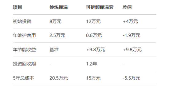 數(shù)據(jù)表明,雖然初始投資高50%,但可拆卸方案可在14個(gè)月內(nèi)通過節(jié)能收益收回差價(jià)。
